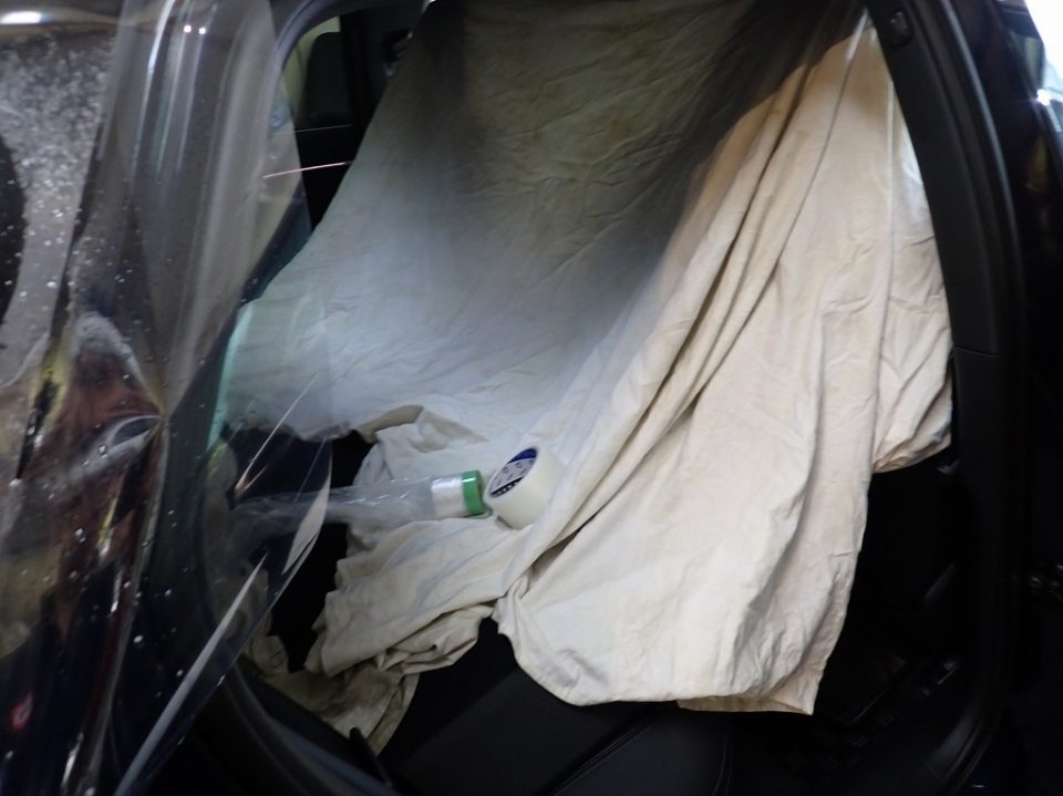フィルム施工の際は、内装パネルなどを丁寧に取り外し、車内を傷つけたり汚したりしないよう、しっかりと養生(保護)を施しながら作業を進めます。
